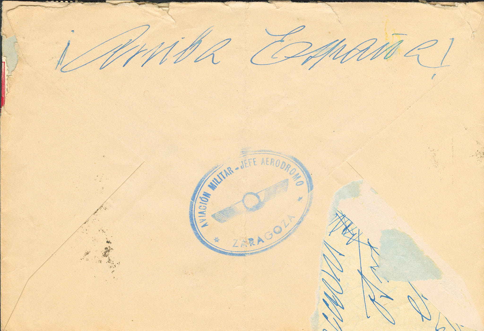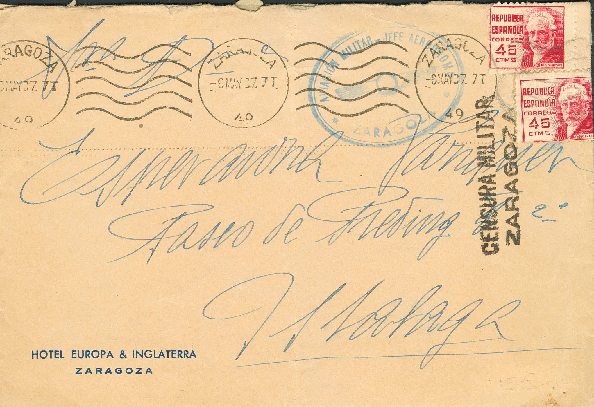 737(2). 1937. 45 cts carmine, two stamps. ZARAGOZA to MALAGA. On the front, the mark is MILITARY AIRPORT CHIEF / ZARAGOZA, in blue. MAGNIFICENT.