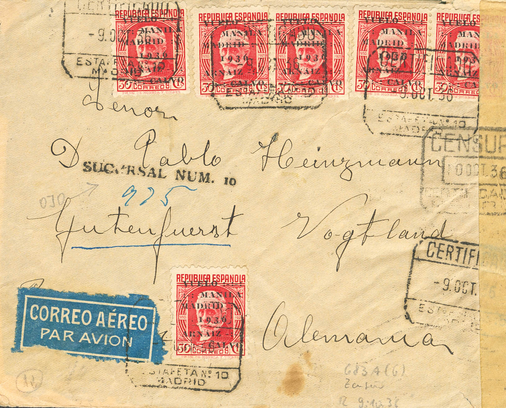 741(6). 1936. 30 cts red, six stamps. Registered mail from MADRID to PLAUNEN (GERMANY). Arrival on the back. MAGNIFICENT AND SPECTACULAR.