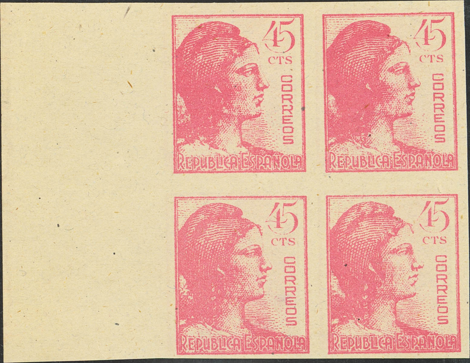 (★) 752ers(4). 1938. 45 cts pink, block of four. IMPERTED and PRINTED ON OBVERSE AND REVERSE. MAGNIFICENT. Edifil 2015: +148 Euros