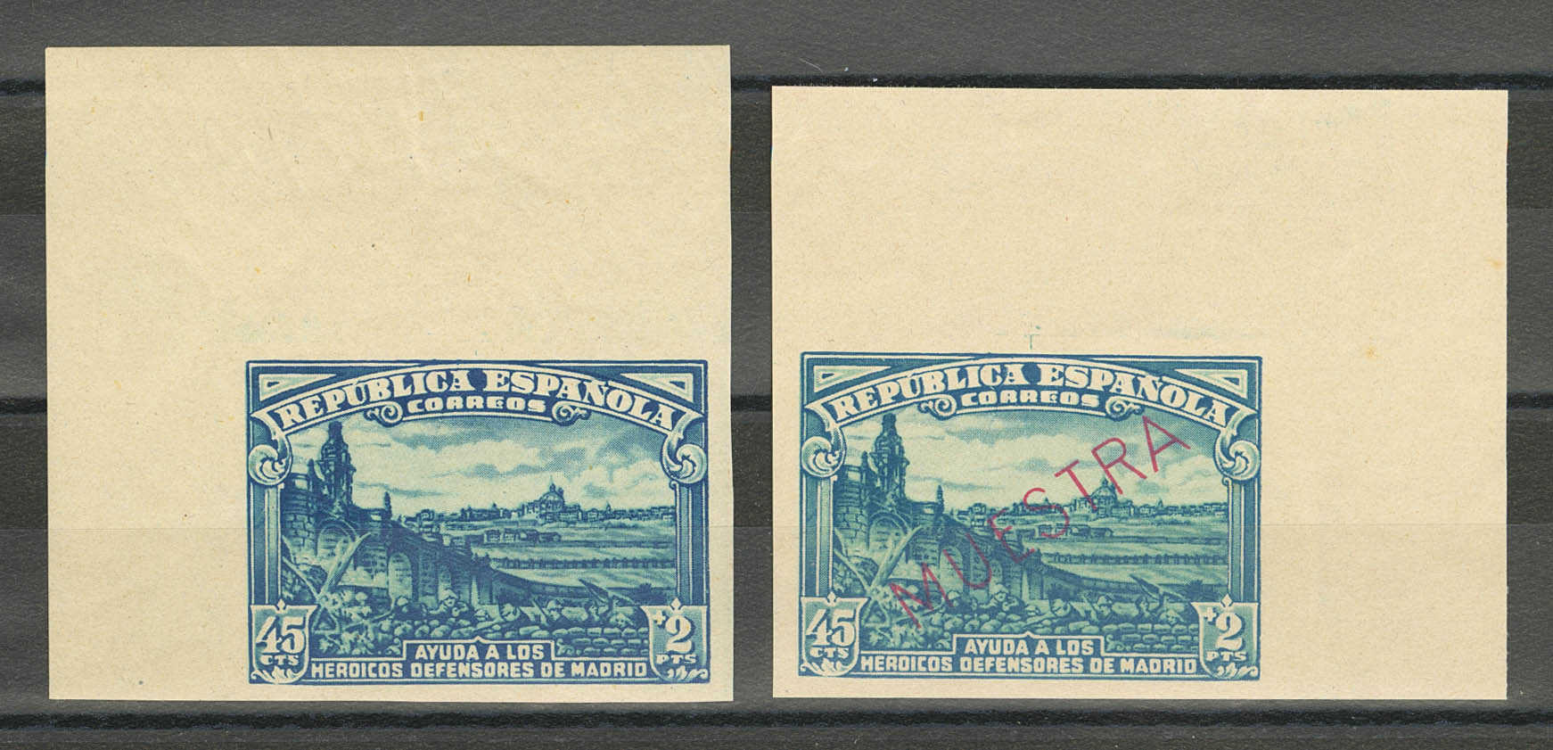 ★★/(★) 757s, 757Ms. 1938. 45 cts + 2 pts blue, two stamps, corner of sheet. INPERTED, one with SAMPLE overprint. MAGNIFICENT. Edifil 2020: 45 Euros