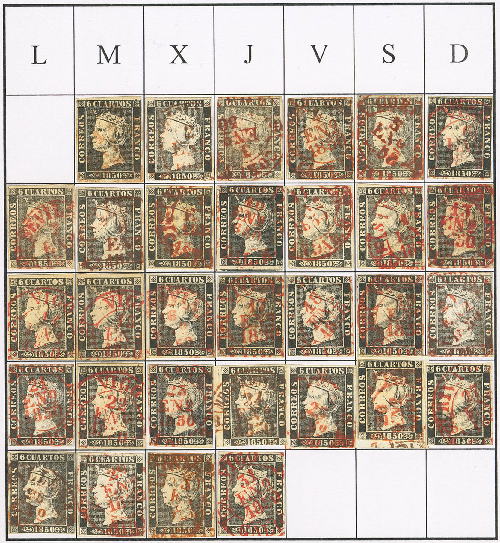 1(31). 1850. Reconstruction of the January calendar (of exceptional quality) containing all thirty-one days of January, all from Plate I and canceled with the BAEZA postmark in red. MAGNIFICENT AND EXTRAORDINARILY RARE COMPLETE CALENDAR FOR THE MONTH OF JANUARY 1850. THIS IS THE FIRST TIME IT HAS BEEN OFFERED BY IBERPHIL. Cert. GRAUS (January 1).
