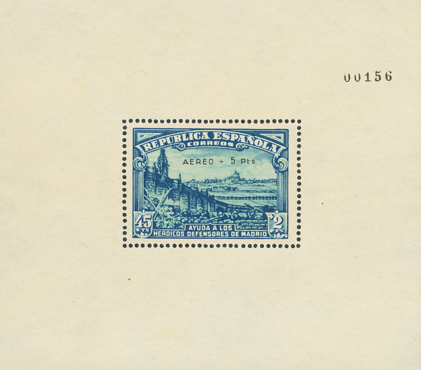 (★) 760. 1938. Souvenir sheet (normal condition). Airmail + 5 pesetas. Magnificent and rare. Cert. CEM. Edifil 2026: 4,000 Euros