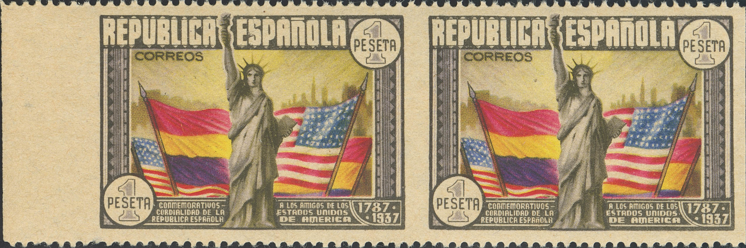 ★★ 763sv(2). 1938. 1 pt multicolor, pair. NO VERTICAL PERFORATIONS. MAGNIFICENT. Edifil 2020: +136 Euros