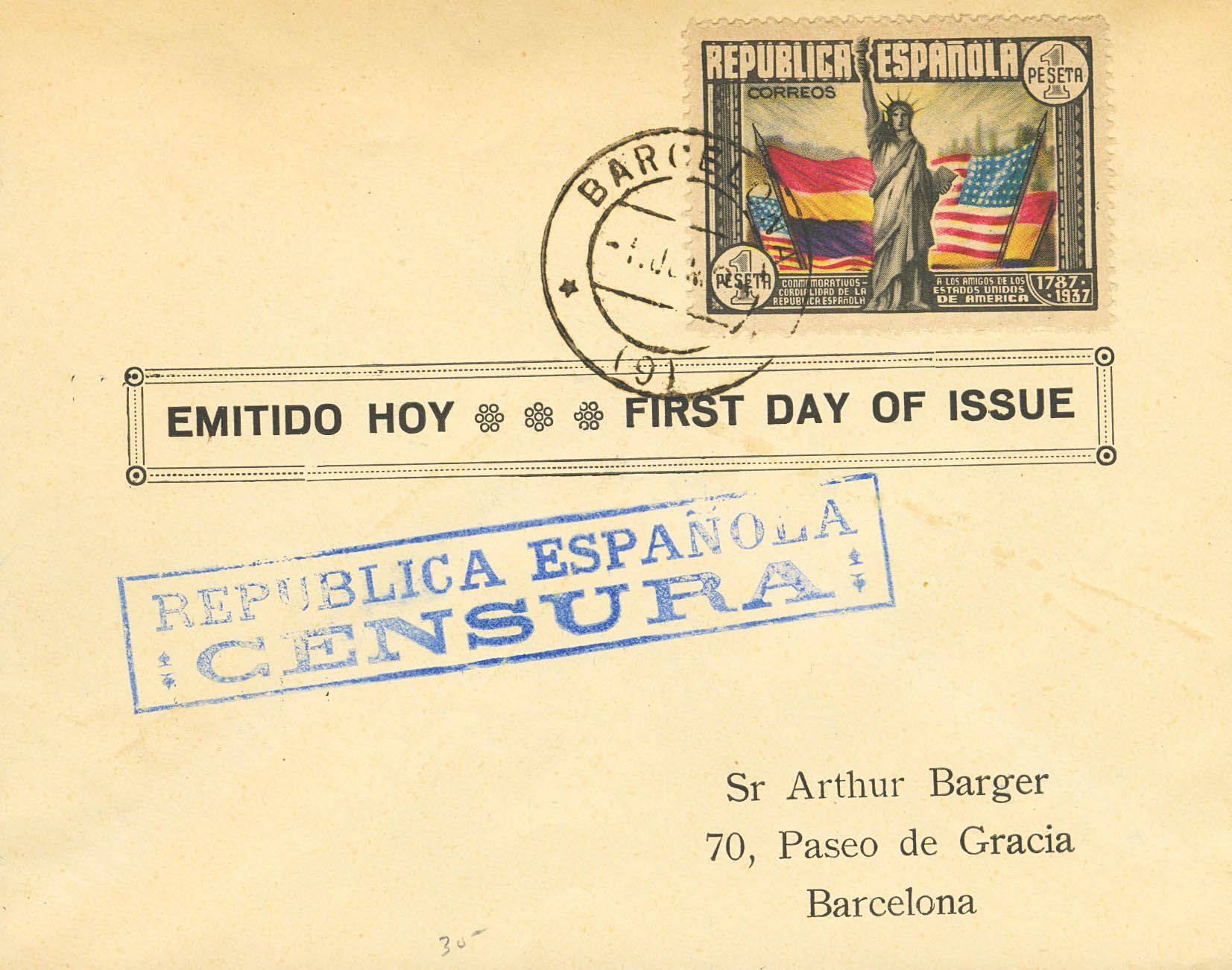 763. 1938. 1 pt multicolor. First Day Cover, Barcelona Interior Mail. MAGNIFICENT.