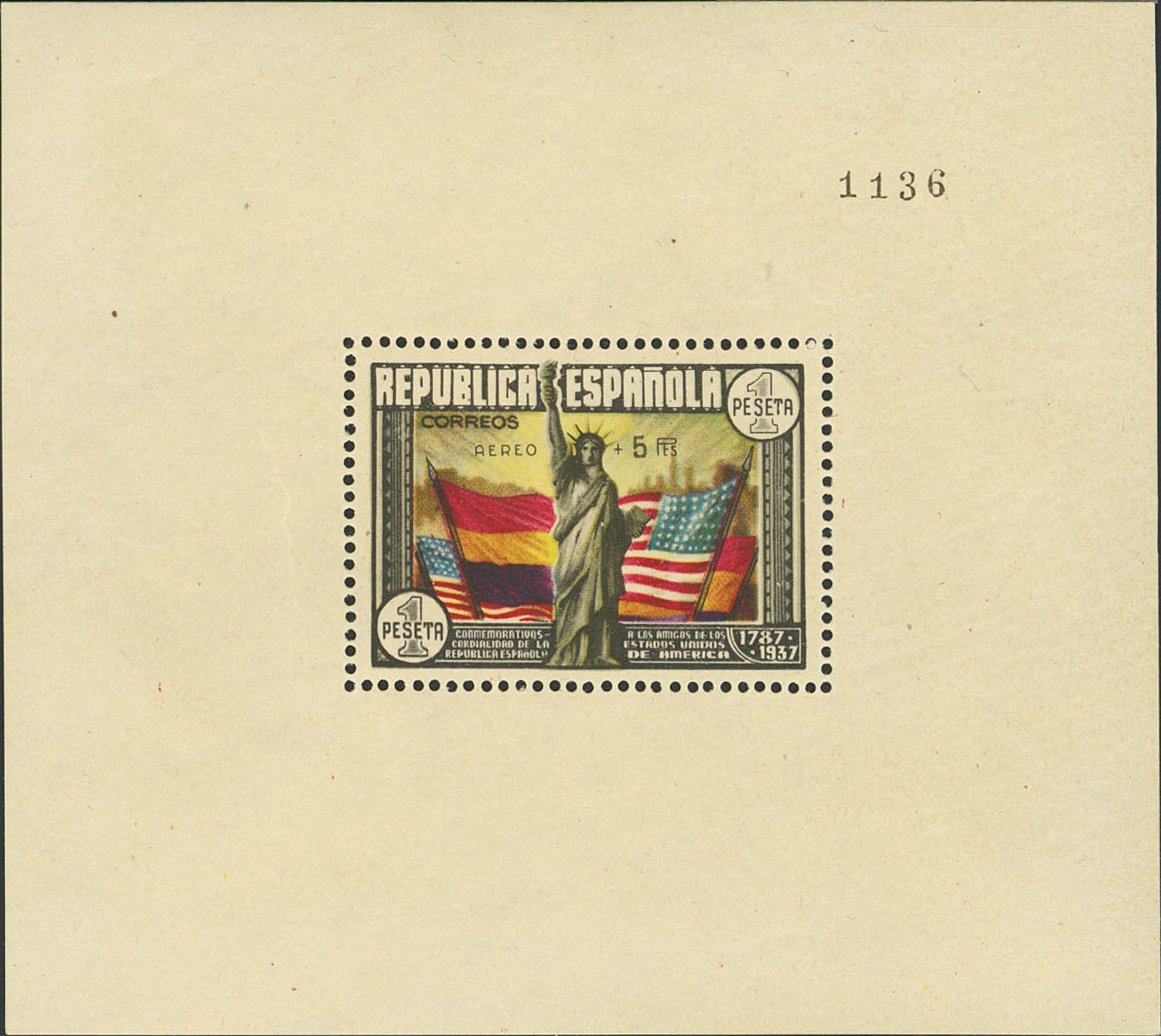 ★★ 766. 1938. Souvenir sheet. Airmail + 5 points. Magnificent and rare. Cert. CEM. Edifil 2026: 2,000 Euros