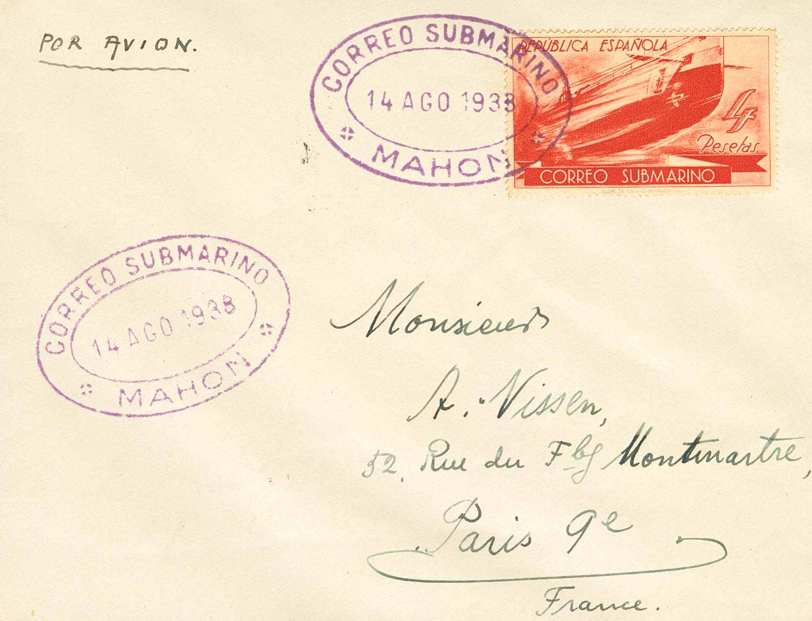 777. 1938. 4 pts orange. Submarine Mail from MAHON to PARIS (FRANCE). Arrival on the back. MAGNIFICENT AND VERY RARE, ALTHOUGH PHILATELIC CIGoodLE TRULY.