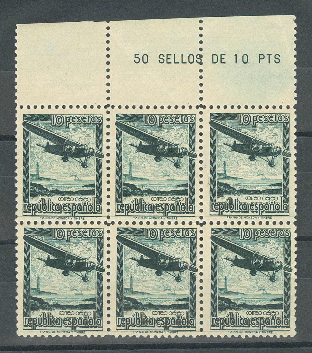 ★★ NE38N(6). 1939. 10 pts green black, block of six (excellent centering). NºA000,000. MAGNIFICENT. Edifil 2020: 474 Euros