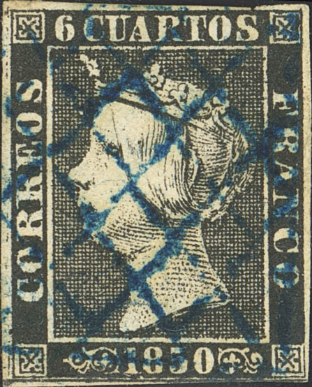 1. 1850. 6 cuartos black (I-23). Postmark PARRILA DE LERIDA, in blue. MAGNIFICENT AND VERY RARE. Cert. GRAUS.