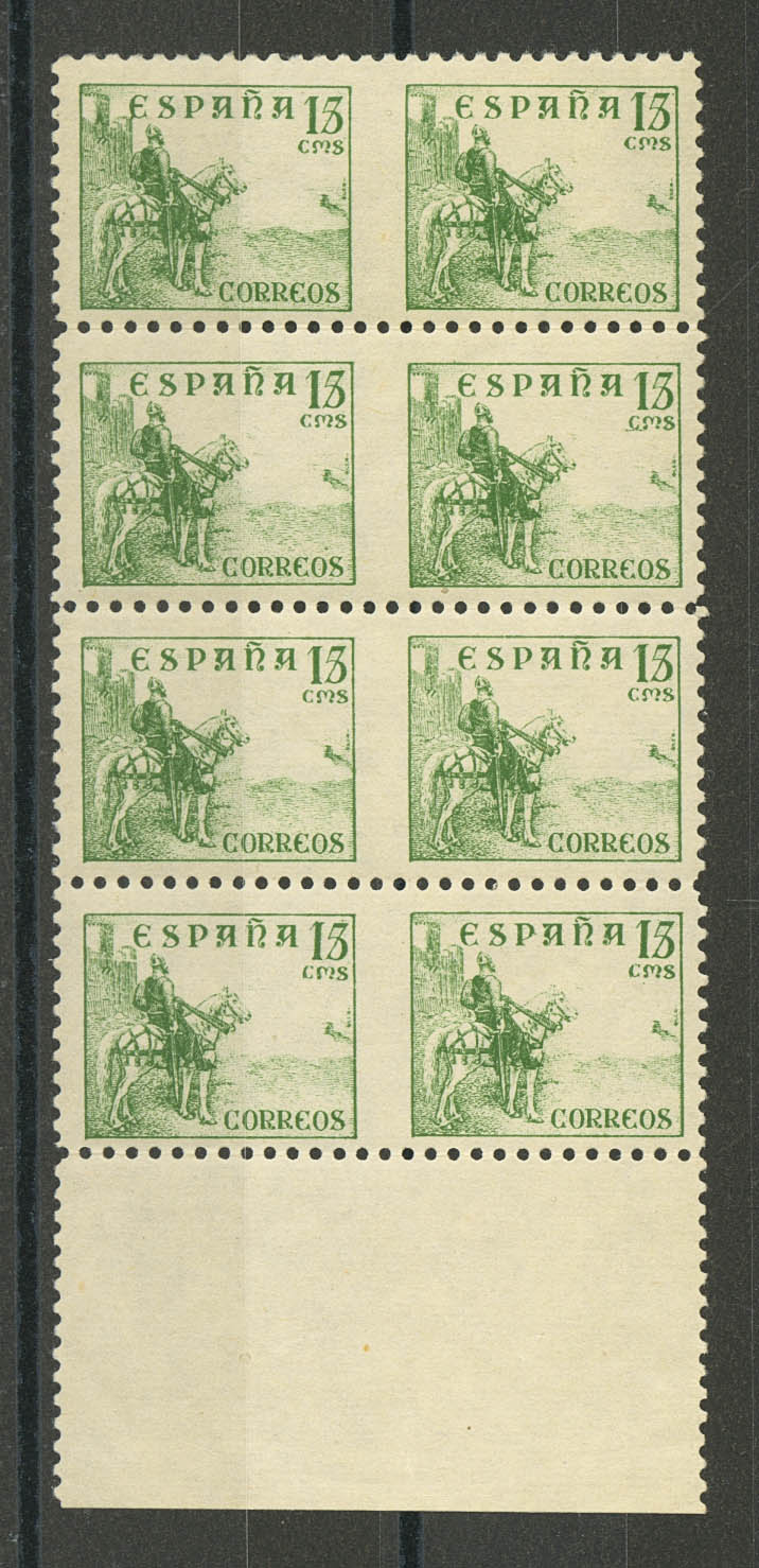 ★★ 819sph(8). 1937. 15 cts green, block of eight, leaf rim (corresponds to four horizontal pairs). UNPERFORATED IN THE MIDDLE. MAGNIFICENT AND SPECTACULAR. Edifil 2025: ++50 Euros