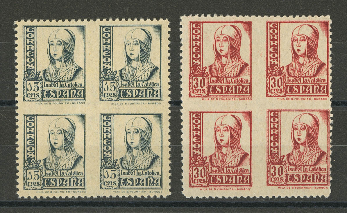 ★★ 820sbc(4), 823sbc(4). 1937. 15 cts slate and 30 cts rose, block of four. INPERTED BETWEEN THE STAMPS. MAGNIFICENT. Edifil 2025: 82 Euros