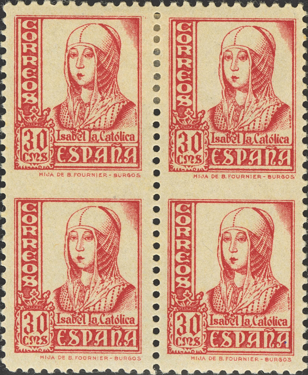 ★★/★ 823spv(4). 1937. 30 cts pink, block of four (corresponds to two vertical pairs). UNPERFORATED IN THE MIDDLE. MAGNIFICENT. Edifil 2025: 30 Euros