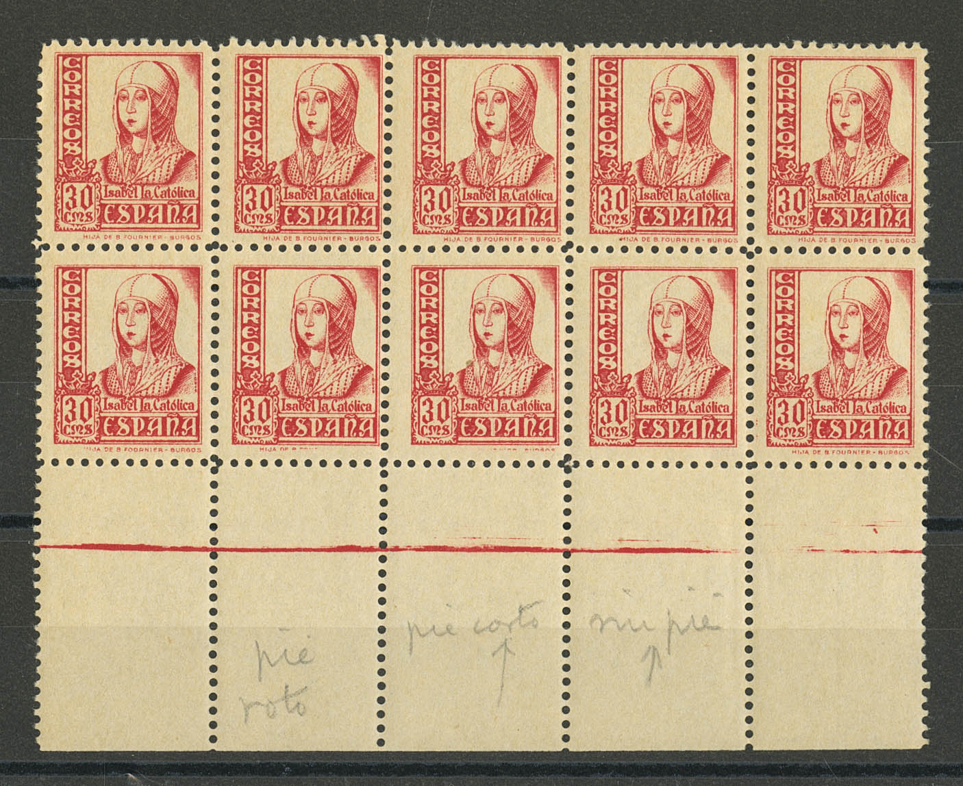 ★★ 823(10). 1937. 30 cts pink, block of ten, leaf edge. Three stamps. PRINTER'S FOOT VARIETIES (broken foot, short foot and no foot). MAGNIFICENT.