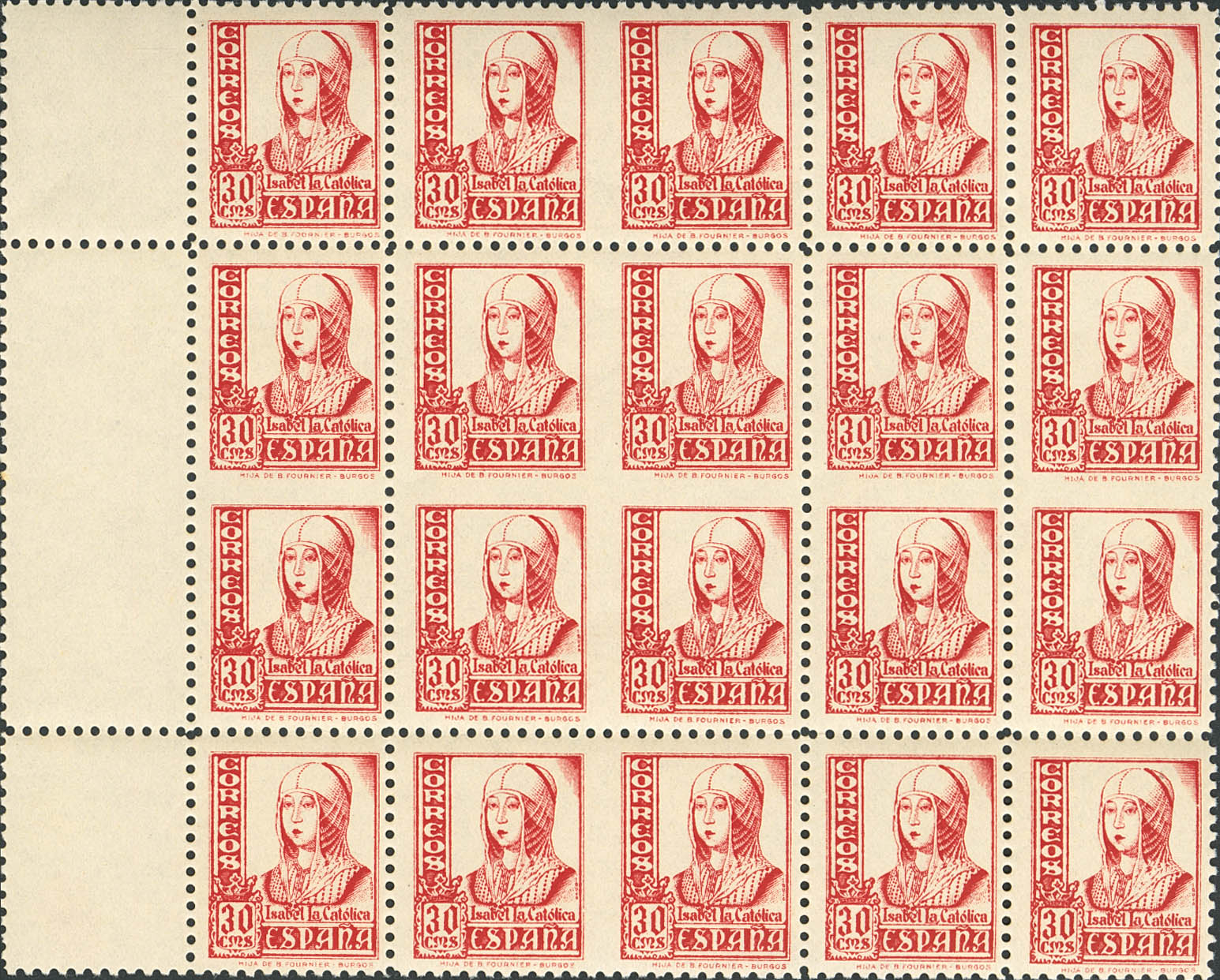 ★★ 823sph(2),823spv(3),823sbc,823. 1937. 30 cts rose, block of twenty including two horizontal pairs INAPPLICABLE IN THE CENTER, three vertical pairs INAPPLICABLE IN THE CENTER and a block of four INAPPLICABLE BETWEEN THE SEALS. MAGNIFICENT AND SPECTACULAR BLOCK.