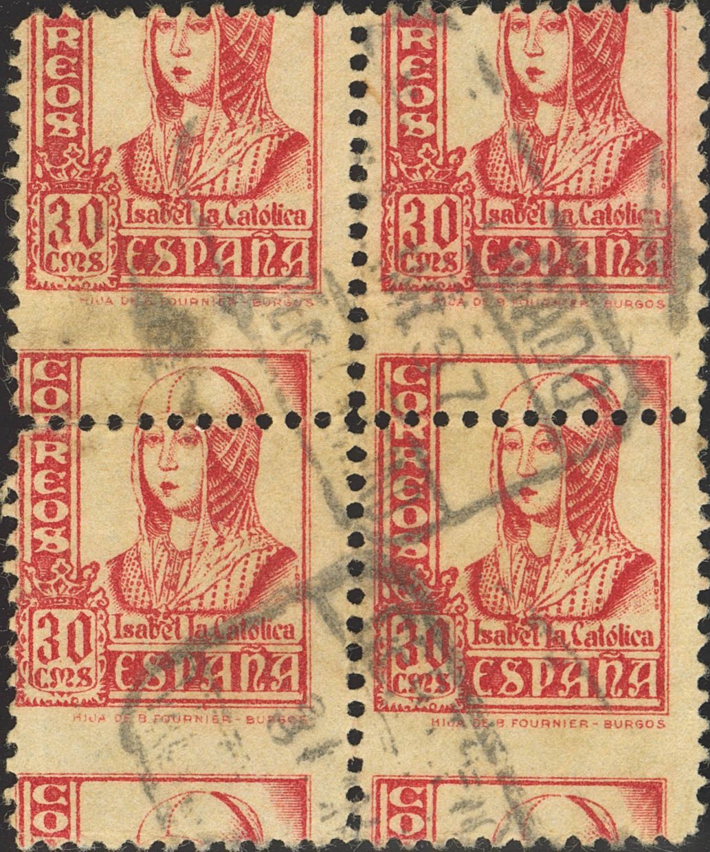 823dh(4). 1937. 30 cts pink, block of four. HORIZONTALLY DISPLACED SERRATION. MAGNIFICENT AND UNUSUAL IN USED CONDITION.