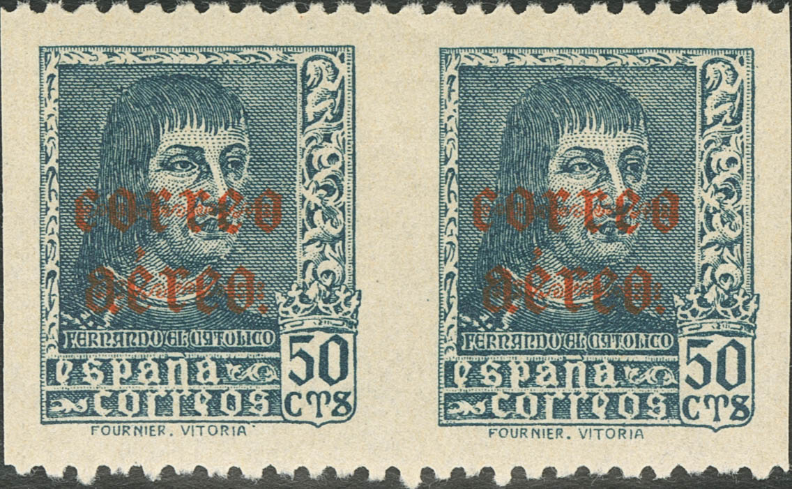 ★ 845sv(2). 1938. 50 cts slate, pair. Variety WITHOUT VERTICAL ROTATION. MAGNIFICENT. Edifil 2021: 210 Euros