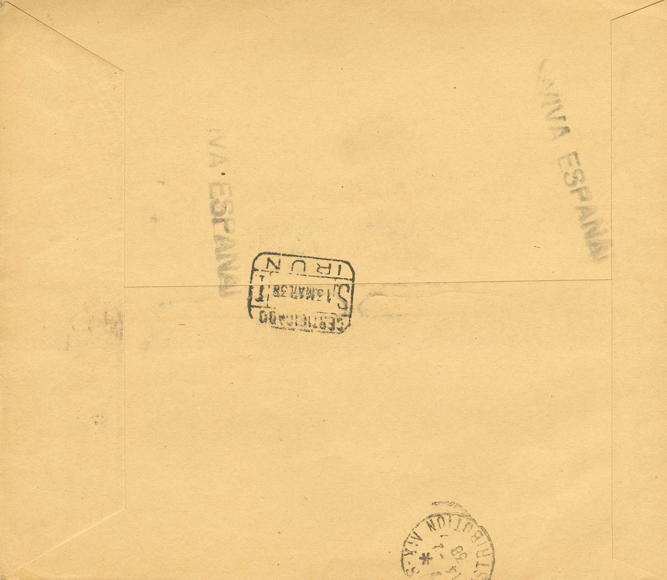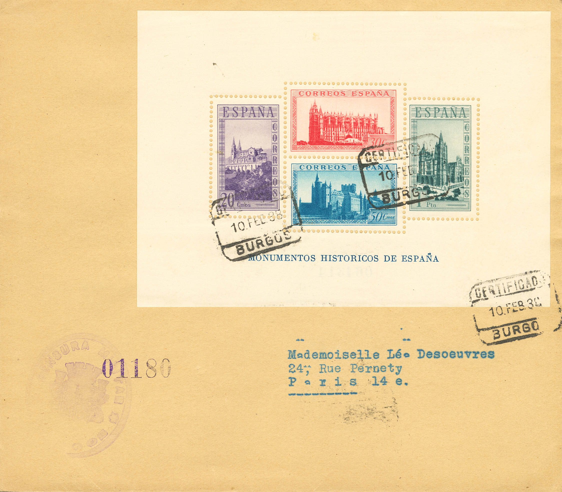 847. 1938. Souvenir sheet. Certificate from BURGOS to PARIS (FRANCE). Arrival on the reverse. MAGNIFICENT AND RARE, TRULY CIGoodULATED.