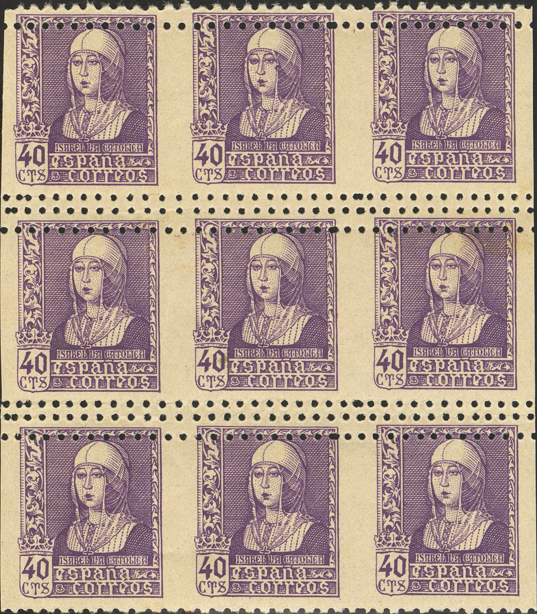 ★★ 858sva(4). 1938. 40 cts violet, block of four. Triple horizontal perforation. Magnificent and spectacular. Edifil 2020: +++120 Euros