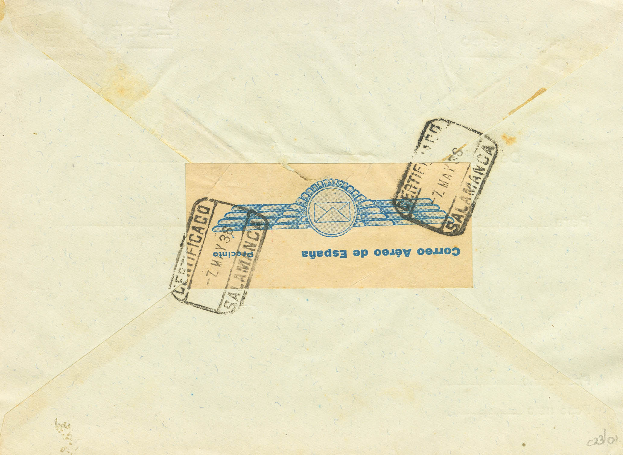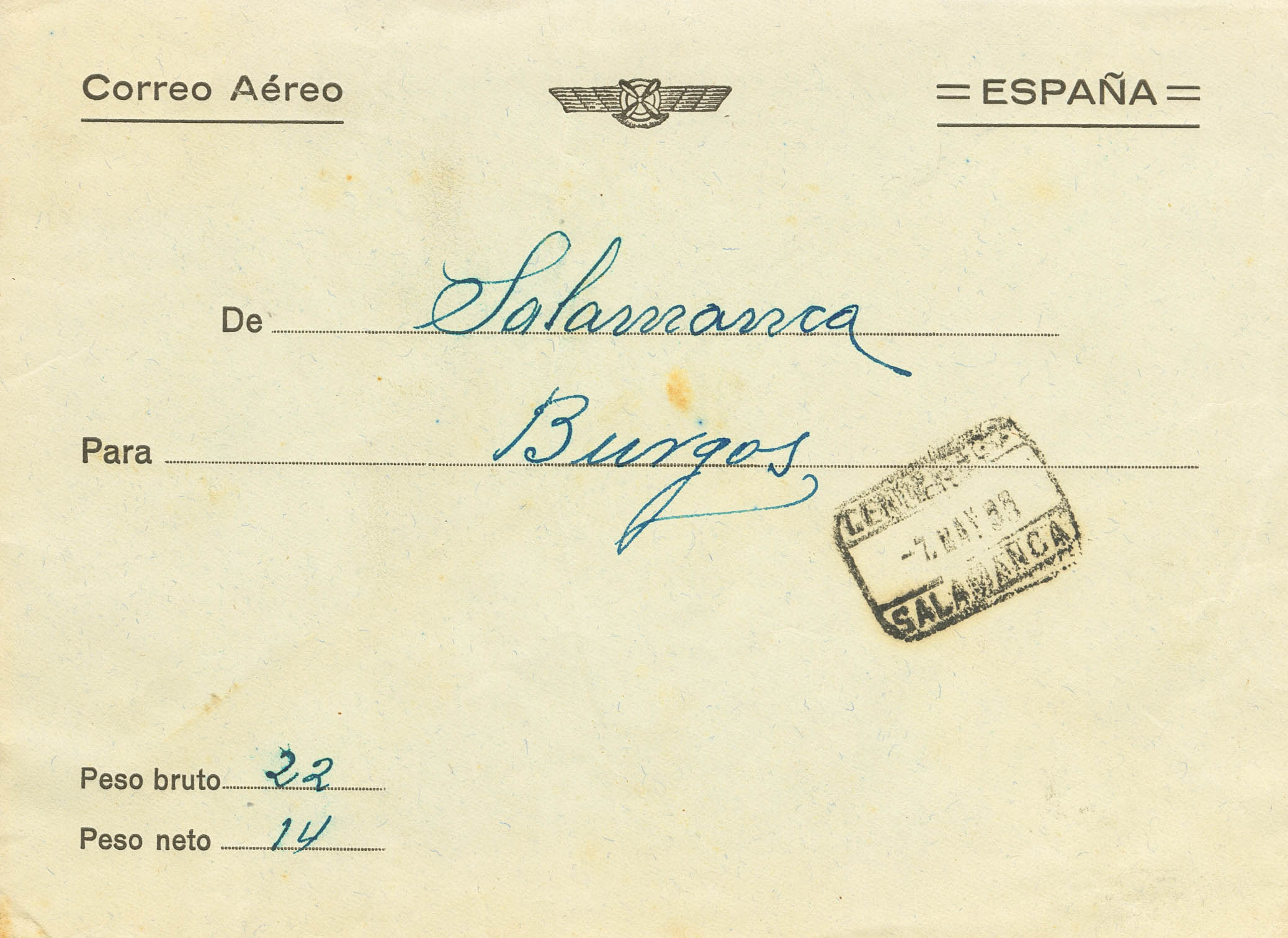 1938. Envelope. Franchise Certificate Airmail from SALAMANCA to BURGOS. Arrival on the back. MAGNIFICENT AND RARE.
