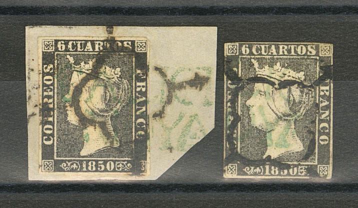 1, 1A. 1850. Set of two 6 cuartos black stamps (Type I and II), both with a mixed postmark: SPIDER, in black, and GALICIA / NOYA, in blue. MAGNIFICENT. Cert. GRAUS (type I).