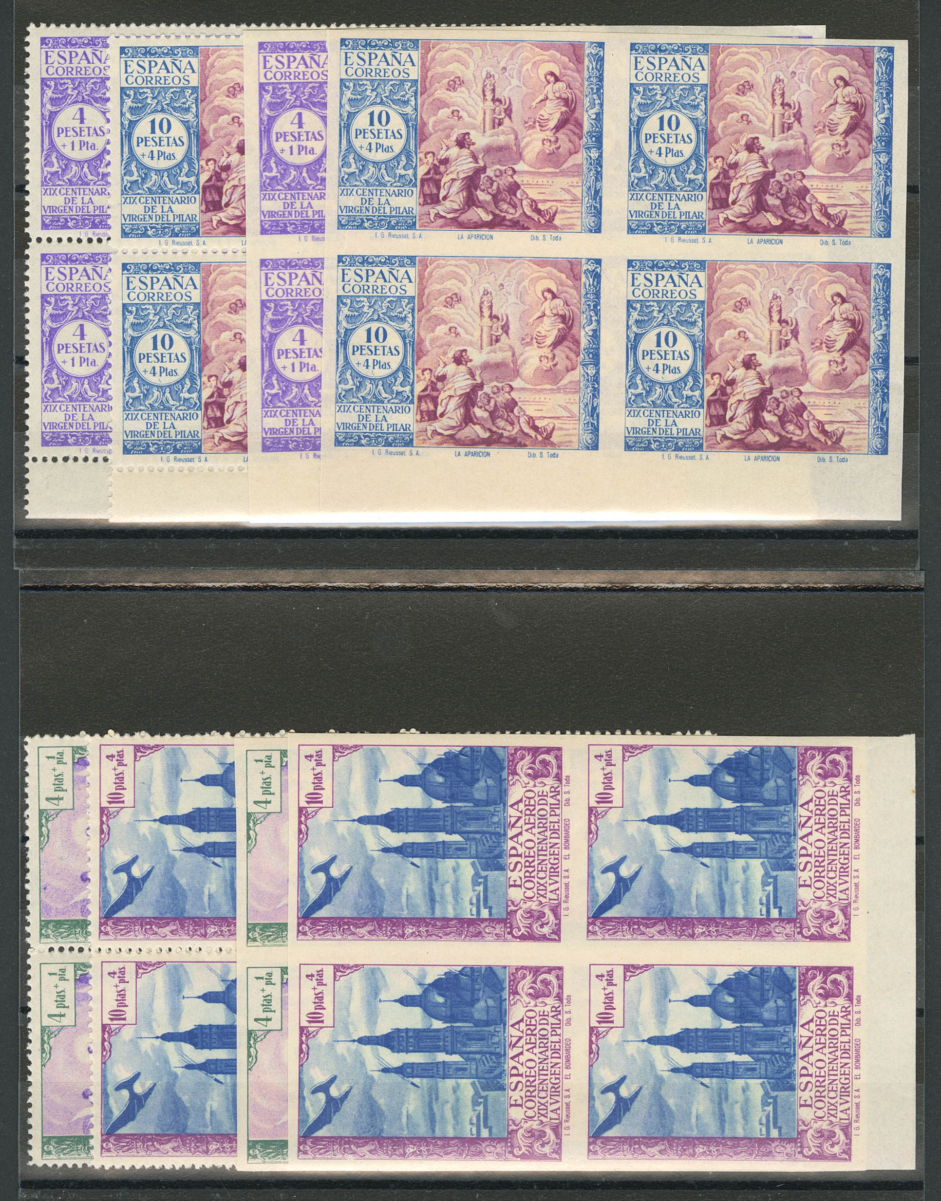 ★★ 901/02cc and ccs, 912/13cc and ccs. 1940. Set of COLOR CHANGES (toothed and non-toothed), in blocks of four of the terrestrial and aerial Pillar. MAGNIFICENT. Edifil 2021: 2,736 Euros