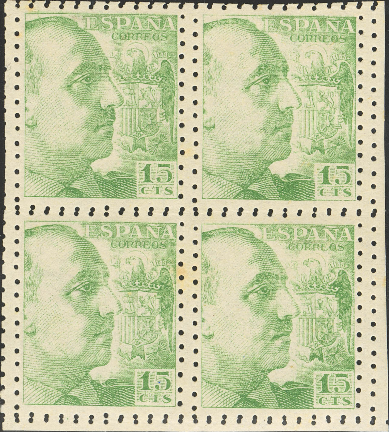 ★★/★ 921dd(4). 1940. 15 cts green, block of four (one stamp with a small age stain, indicated for informational purposes only). DOUBLE PERFORATED. EXCELLENT. Edifil 2025: 220 Euros
