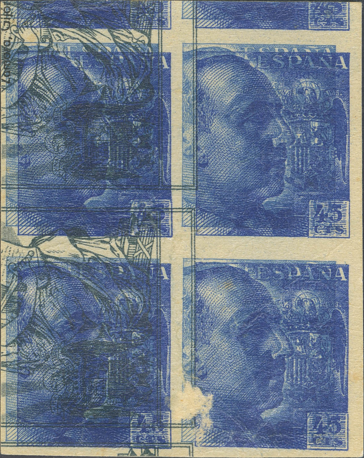 (★) 926P(4). 1940. 45 cts blue, block of four. COLOR TRIAL ON LOTTERY PAPER, obverse and reverse. MAGNIFICENT.