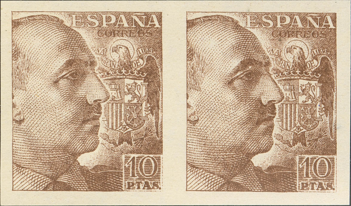 ★★ 935s(2). 1939. 10 pts chestnut, pair (with original paper and gummed paper; cardboard insert also exists). IMPERTED. MAGNIFICENT AND EXTRAORDINARILY RARE, A PIECE OF ENORMOUS INTEREST AND IMPORTANCE. Cert. CEM.