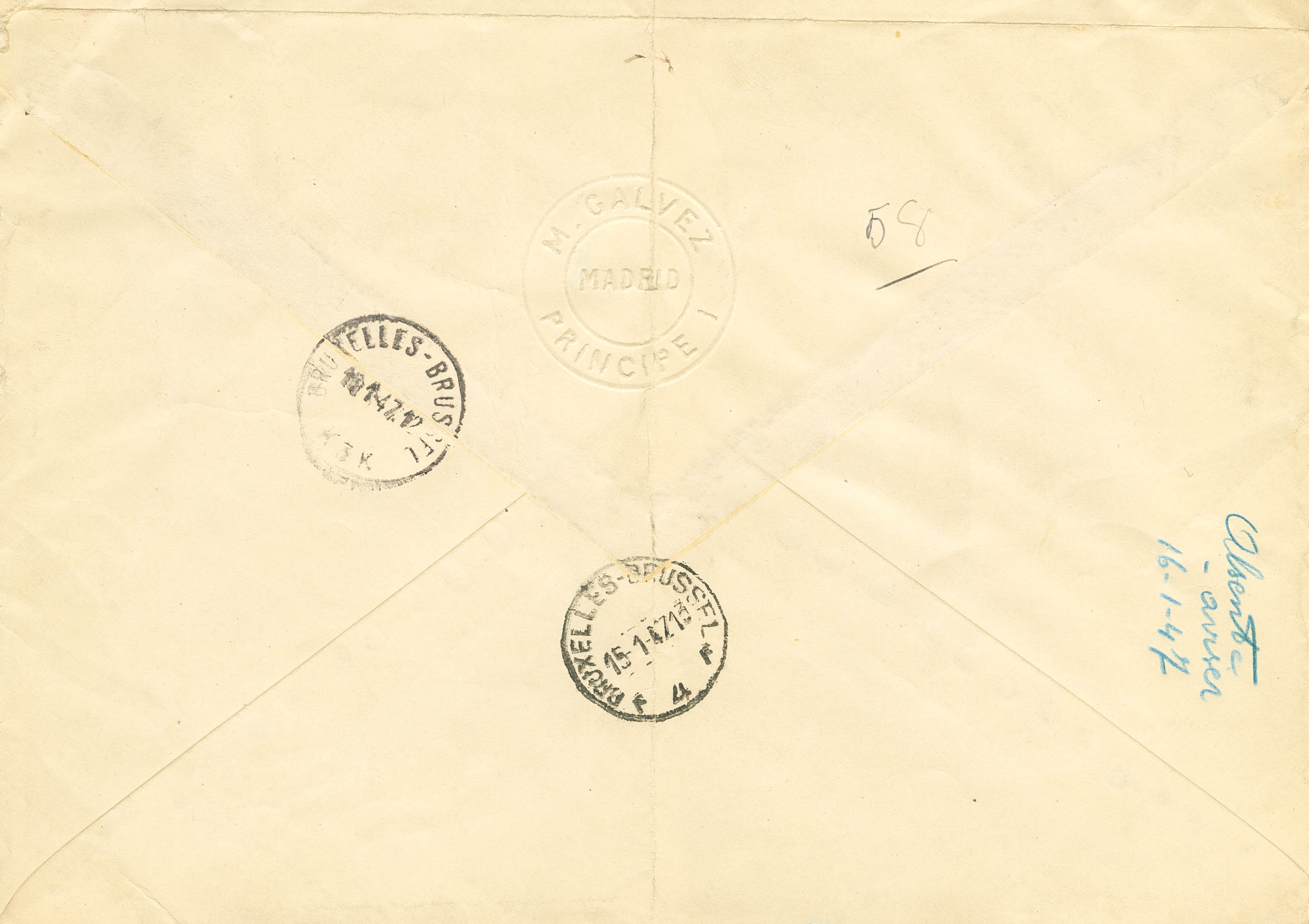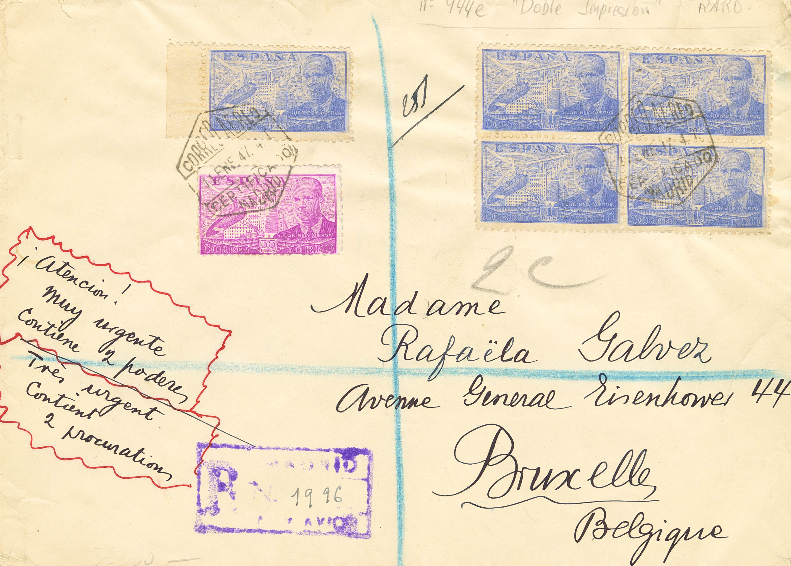 944ed(5), 942. 1947. 1 pt blue, five DOUBLE PRINTED stamps and 35 ct pink lilac. Registered from MADRID to BRUSSELS (BELGIUM). Arrival on the back. MAGNIFICENT AND RARE VARIETY OF CIGoodULATED LETTER ENVELOPE.