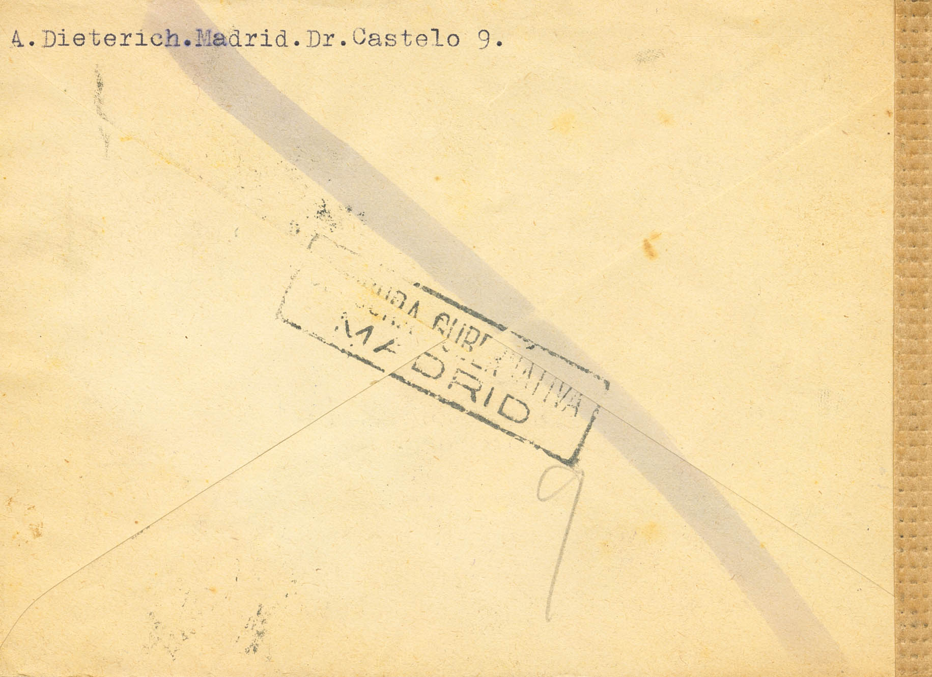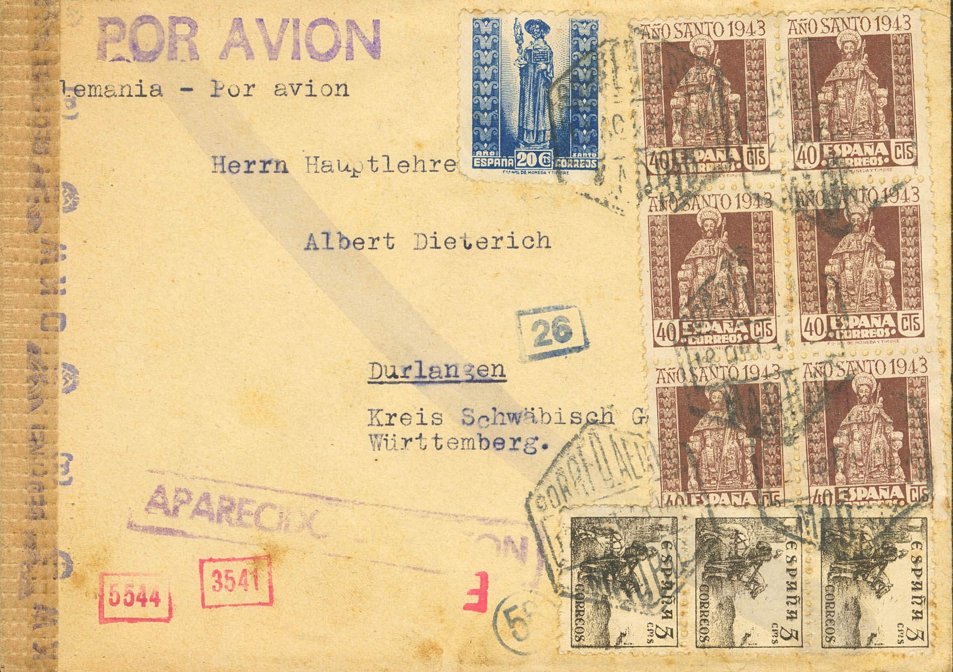 961, 962(6). 1943. 20 cts blue and 40 cts brown, block of six. Airmail from MADRID to DURLANGEN (GERMANY). On the front, various German postal control marks. EXCELLENT.