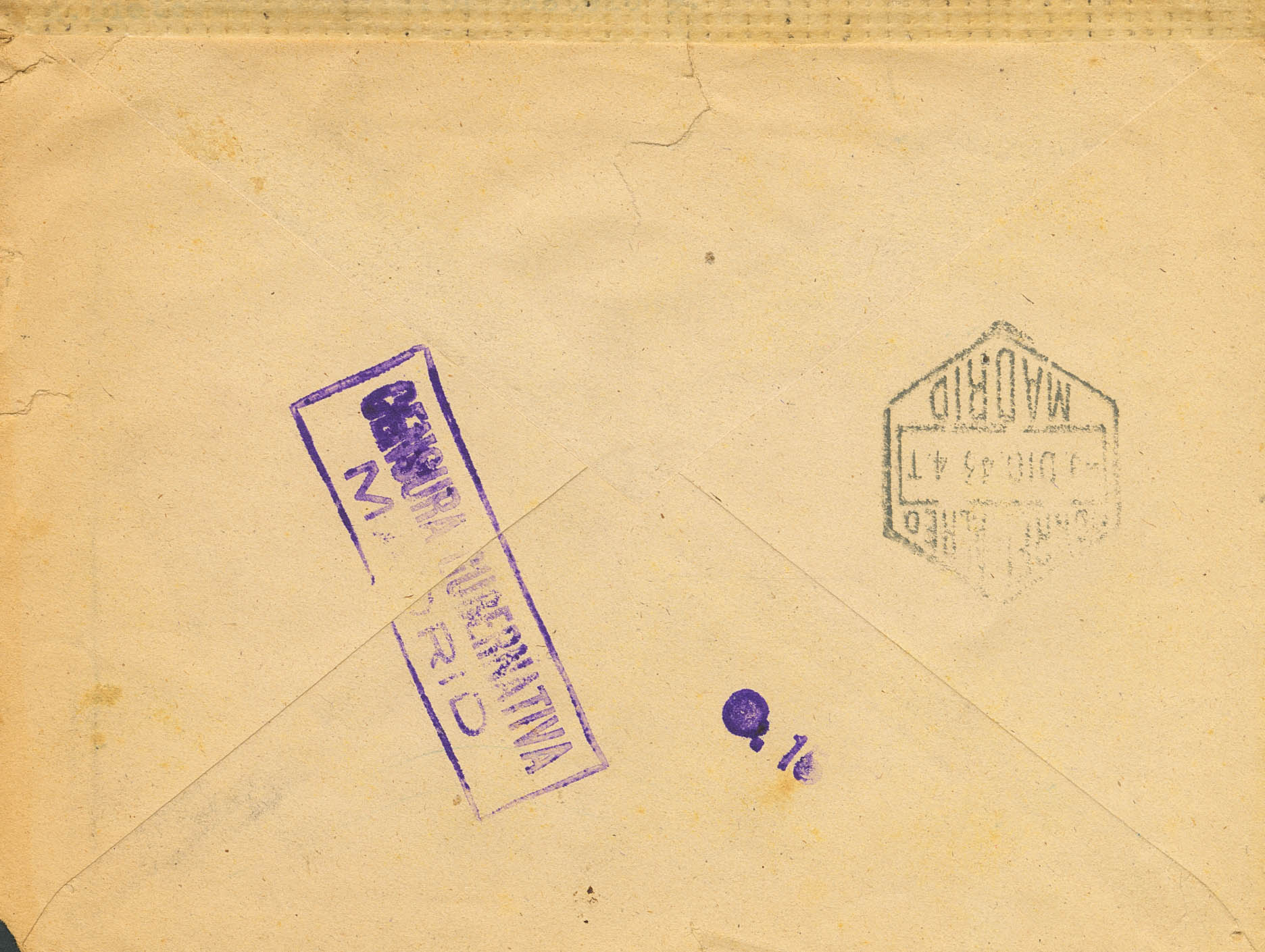 965(6). 1943. 40 cts green, block of four and one pair. Airmail from MADRID to DURLANGEN (GERMANY). On the front, various German postal control marks. EXCELLENT.