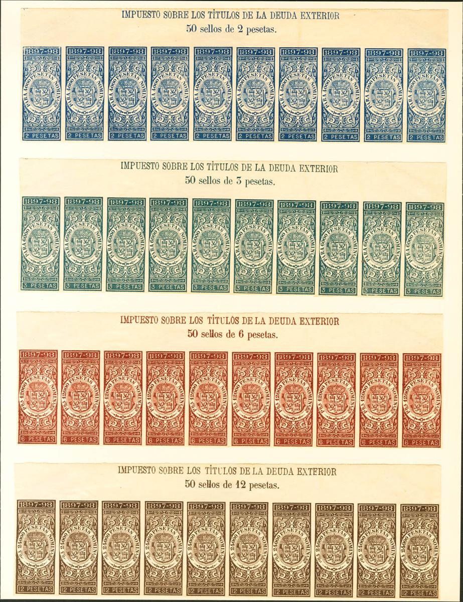 ★★/★1897. Serie completa, ocho valores en tiras de diez con cabecera de pliego. TITULOS DE DEUDA EXTERIOR. SIN DENTAR. MAGNIFICA Y MUY RARO CONJUNTO. (Alemany 9/16)