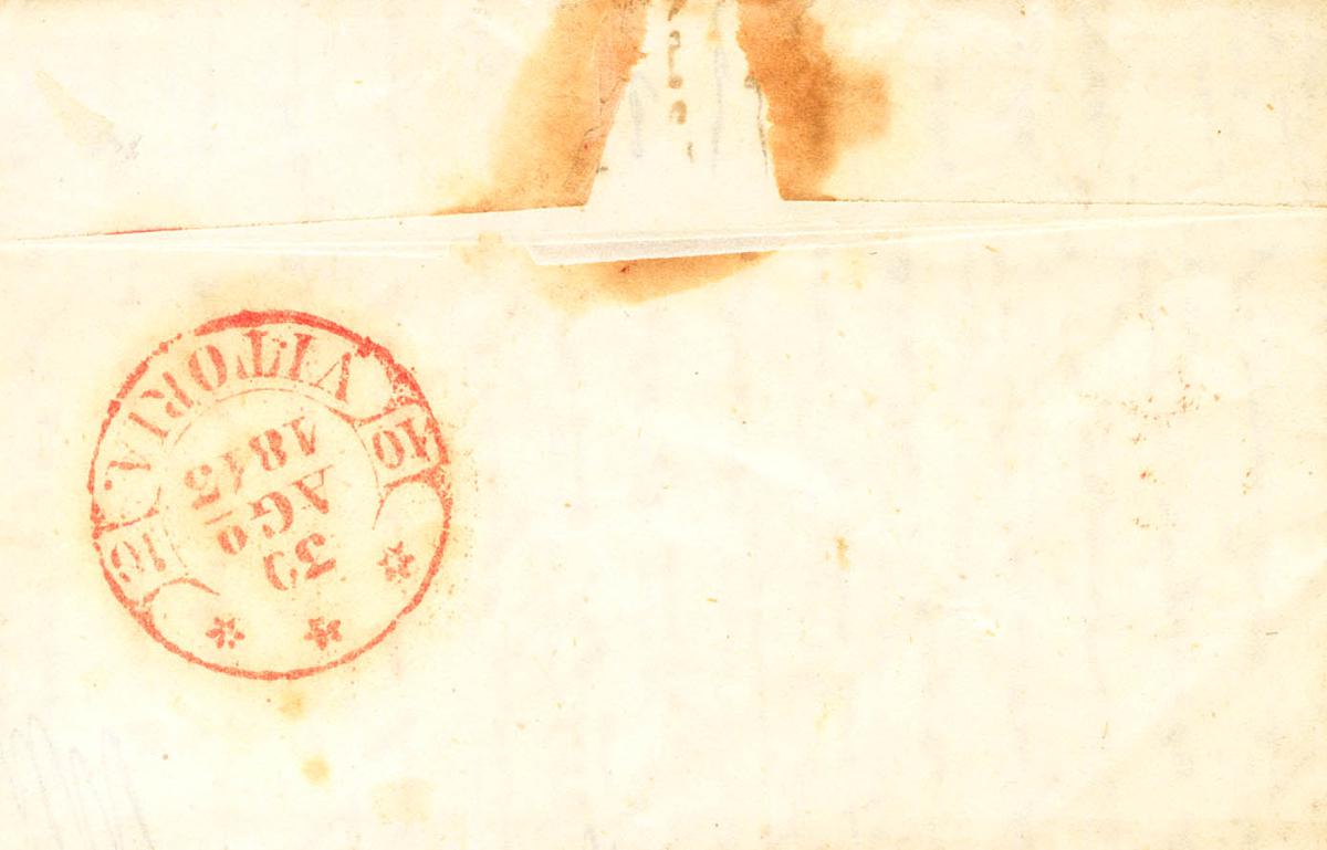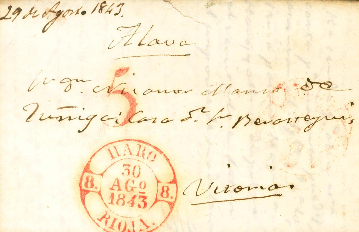 1843. MONTALBO DE CAMEROS a VITORIA, depositada en el correo de Haro (a más de 80 km). Baeza HARO / RIOJA, en rojo. MAGNIFICA Y ESPECTACULAR ESTAMPACION.