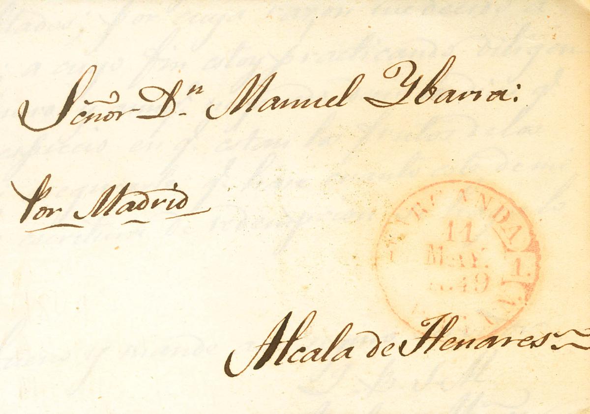 1849. CAMPO REAL (MADRID) a ALCALA DE HENARES. Baeza ARGANDA / CAST.LA N., en rojo. MAGNIFICA Y RARISIMA.