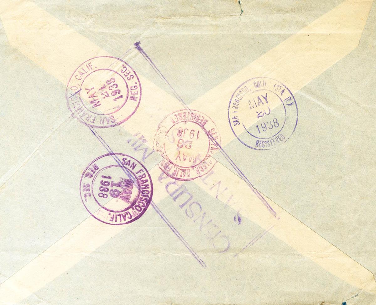 253(2), 253hzd, Local 13. 1938. 30 cts sobre 40 cts azul, tres sellos, uno con variedad "3" INCLINADO, Local de 50 cts azul y dos sellos de España de 5 cts. Certificado de SANTA ISABEL a SAN FRANCISCO (USA). En el frente marcas de la aduana aplicadas a la llegada y al dorso llegada. MAGNIFICA Y RARA.