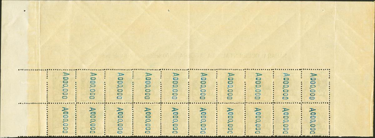 ★★ 14a(20). 1923. 1 cts azul pálido, bloque de veinte, cabecera de pliego. Variedad SIN DIERESIS. MAGNIFICO Y RARISIMO, SEGUNDO MAYOR BLOQUE CONOCIDO. Edifil 2018: +4.000 Euros