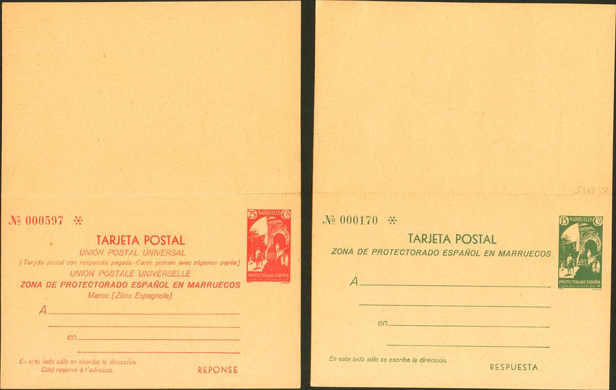 (★) EP22/23. 1933. 15 cts + 15 cts verde y 25 cts + 25 cts rojo sobre Tarjetas Entero Postales, de ida y vuelta. MAGNIFICAS. Edifil 2022: 320 Euros