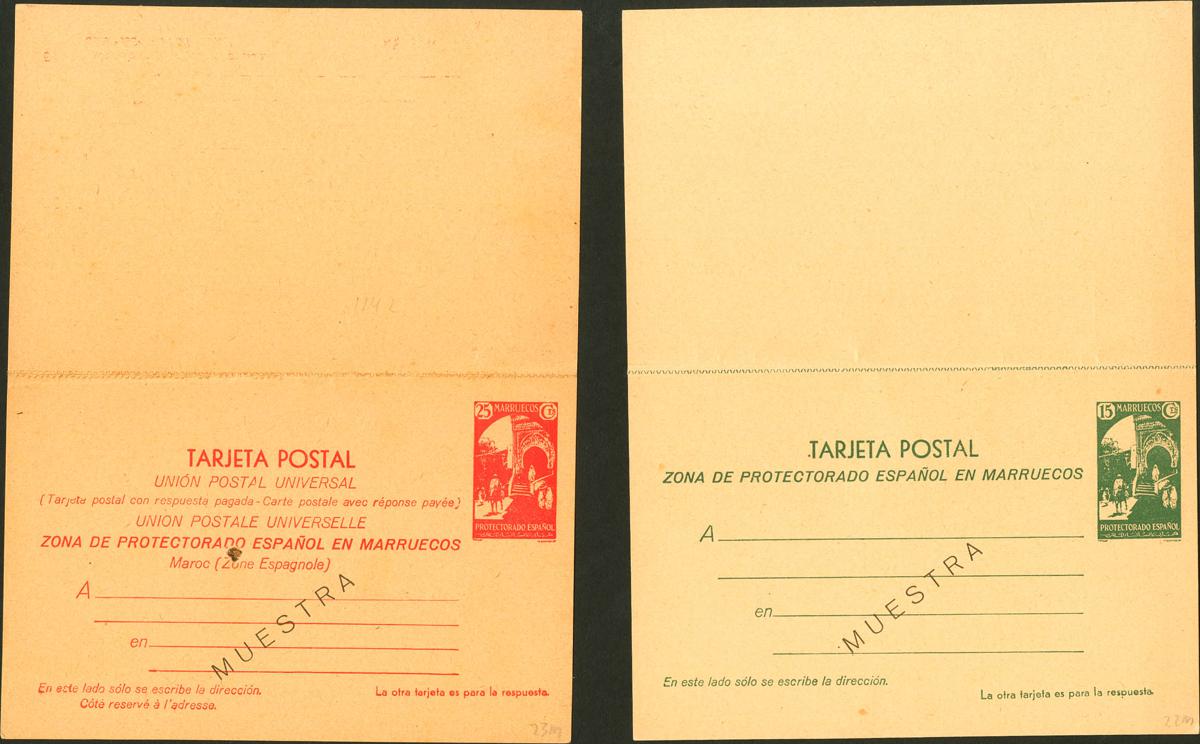 (★) EP22/23M. 1933. 15 cts + 15 cts verde y 25 cts + 25 cts rojo, sobre Tarjetas Entero Postales. MUESTRA. BONITAS. Edifil 2018: 290 Euros