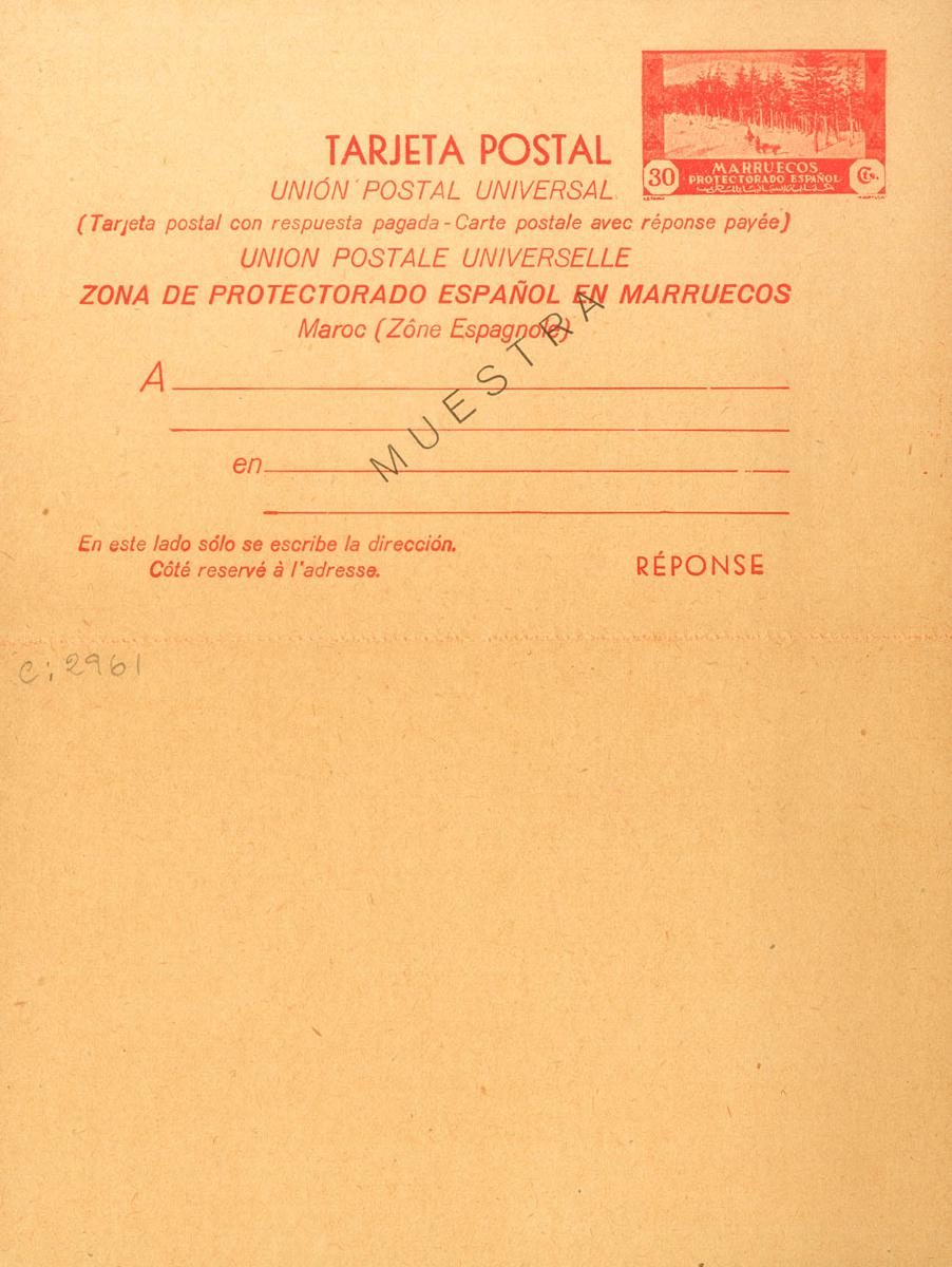 (★) EP25M. 1935. 30 cts + 30 cts rojo sobre Tarjeta Entero Postal, de ida y vuelta. MUESTRA. MAGNIFICA. Edifil 2018: 160 Euros