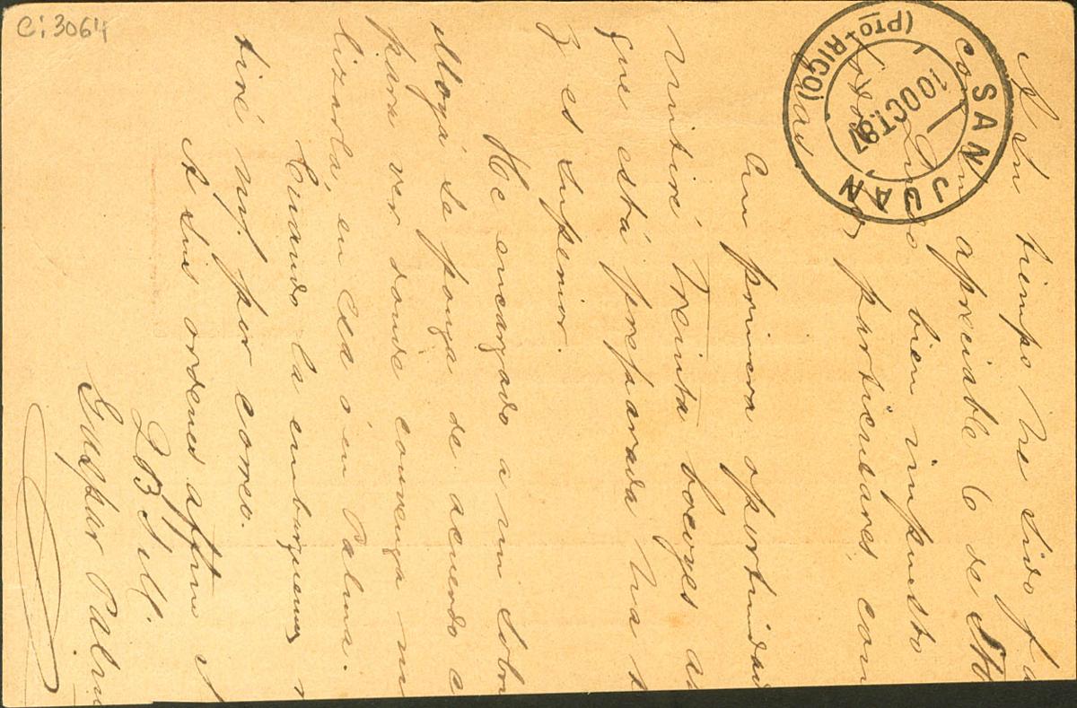EP2. 1887. 3 ctvos castaño sobre Tarjeta Entero Postal de SANTA ISABEL a BARCELONA. Matasello STA ISABEL / (PTO. RICO), en azul (recortada en el margen inferior). BONITA Y RARA.