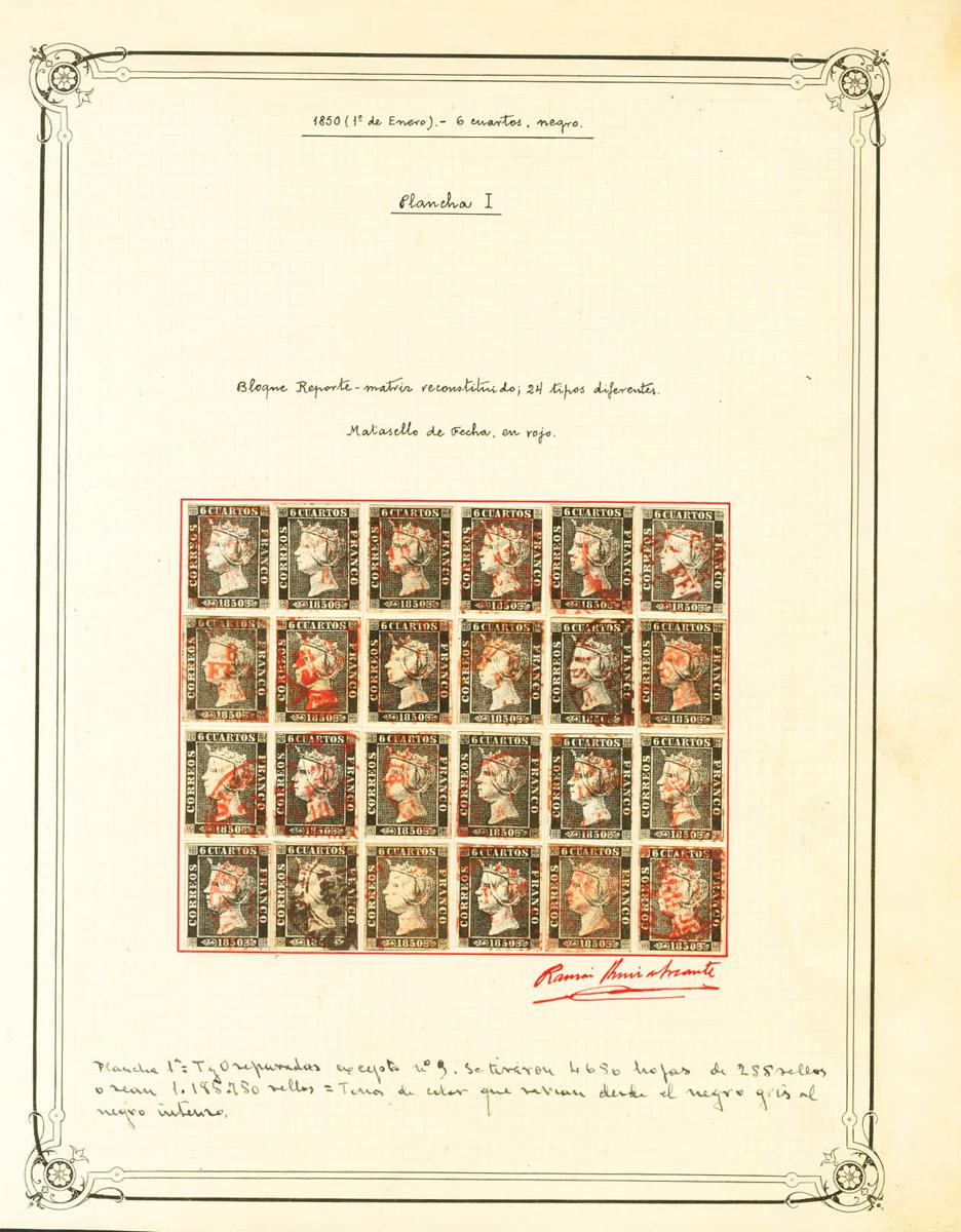 1(24). 1850. Reconstrucción completa del 6 cuartos negro, incluyendo los veinticuatro tipos de la Plancha I e inutilizados con matasello baeza, montado sobre hoja de álbum de época y firmada por Ramón Ruíz de Arcaute. MAGNIFICA Y RARO CONJUNTO, PIEZA DE ENORME IMPORTANCIA PARA EL COLECCIONISMO DEL 6 CUARTOS NEGRO DE 1850. (la reconstrucción esta hecha con sellos de enorme calidad)