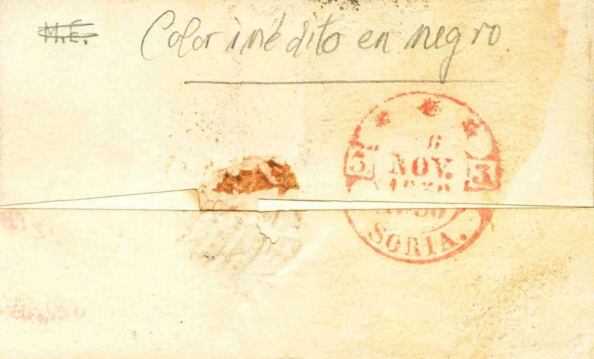 1. 1850. 6 cuartos negro. MEDINACELI a SORIA. Matasello ARAÑA, en rojo y en el frente baeza MEDINACELI / SORIA, en marrón negruzco. MAGNIFICA Y MUY RARA.