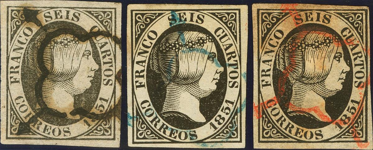 6(3). 1851. Conjunto de tres sellos del 6 cuartos negro inutilizados con matasello ARAÑA, en negro, rojo y azul. MAGNIFICO.