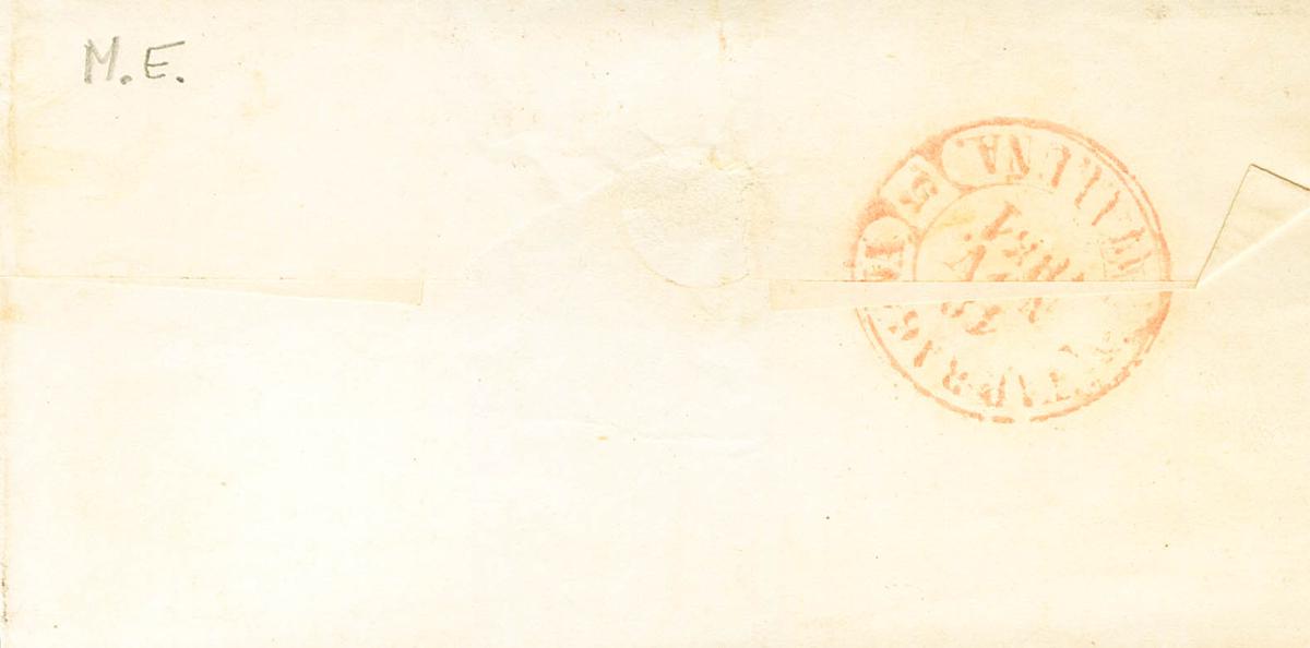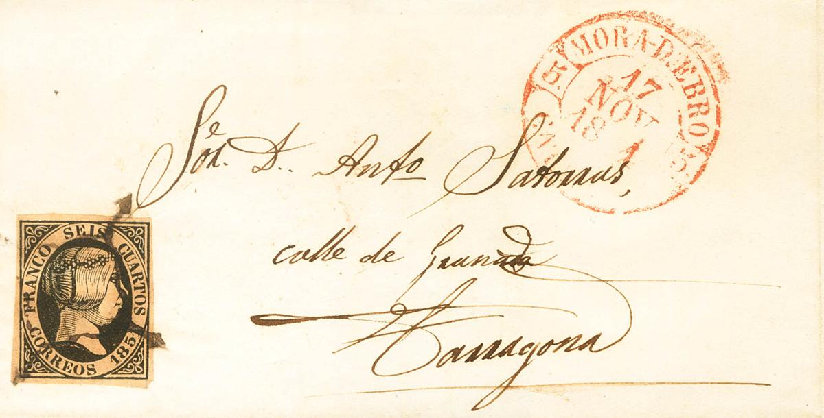 6. 1851. 6 cuartos negro. MORA DE EBRO a TARRAGONA. En el frente baeza MORA D. EBRO / CATALUÑA, en rojo. MAGNIFICA.
