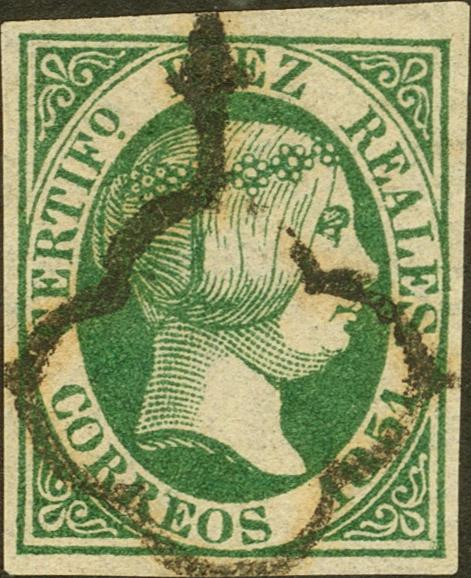 11F. 1851. 10 reales verde. FALSO SPERATI (Tipo A), sin la marca de la B.P.A. al dorso. MAGNIFICO.