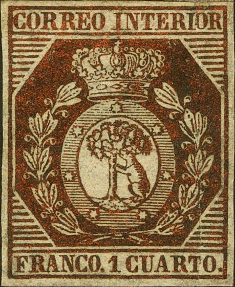 (★) 22. 1853. 1 cuarto bronce (ligero doblez vertical). Grandes márgenes e impresión muy nítida. MAGNIFICO Y ESPECTACULAR. Cert. CEM.