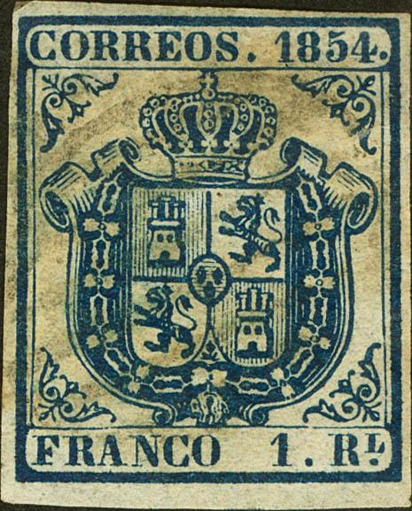 34. 1854. 1 real azul. Color muy intenso. MAGNIFICO.