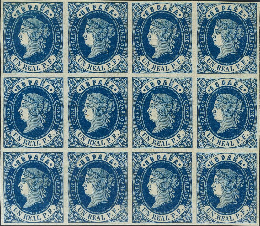 (★) 61P(12). 1862. 1 real azul P.F., bloque de doce. ENSAYO DE PLANCHA. MAGNIFICO Y RARO. (Gálvez 261)