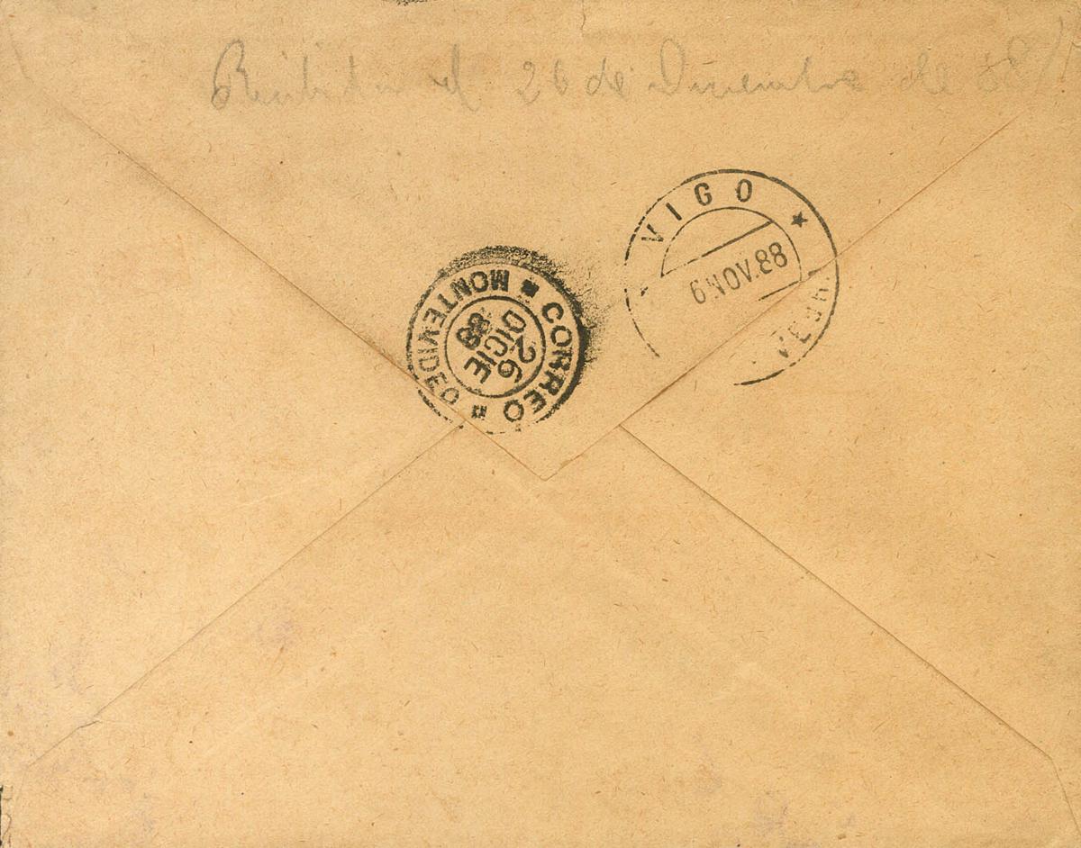 205. 1888. 40 cts castaño. BAYONA (PONTEVEDRA) a MONTEVIDEO (URUGUAY). Matasello BAYONA / (PONTEVEDRA), en azul y al dorso tránsito por Vigo y llegada. MAGNIFICA Y RARA.