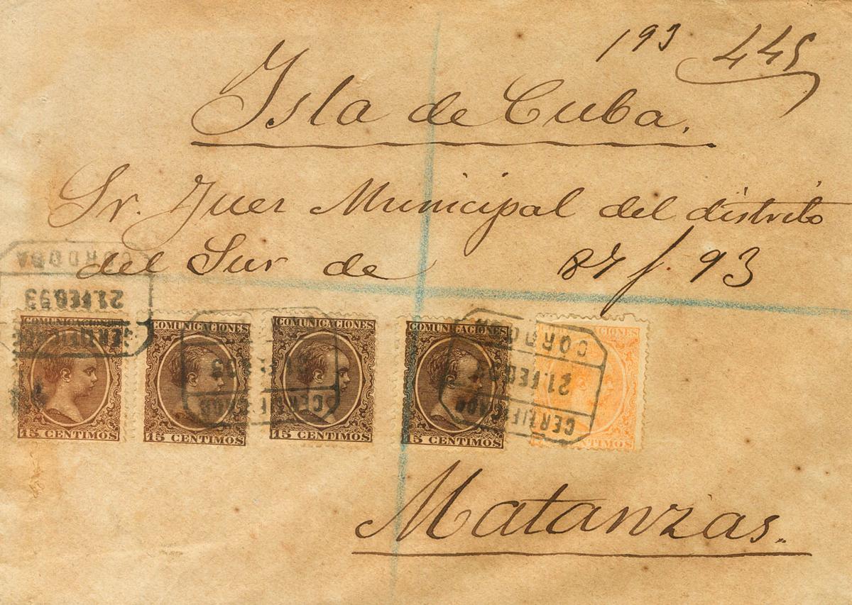 219(4), 225. 1893. 15 cts castaño lila, cuatro sellos y 75 cts naranja. Certificado de CORDOBA a MATANZAS (CUBA). MAGNIFICA Y RARA, PIEZA DE ENORME ESPECTACULARIDAD.