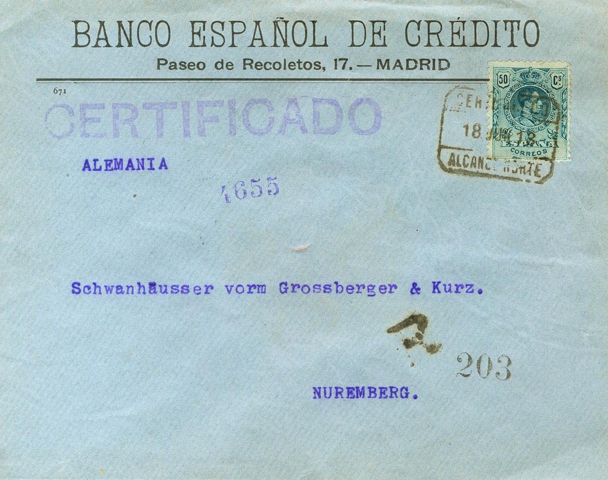 277. 1913. 50 cts azul. Certificado de MADRID a NUREMBERG (ALEMANIA). Matasello CERTIFICADO / ALCANCE NORTE, al dorso numeral de llegada. MAGNIFICA.
